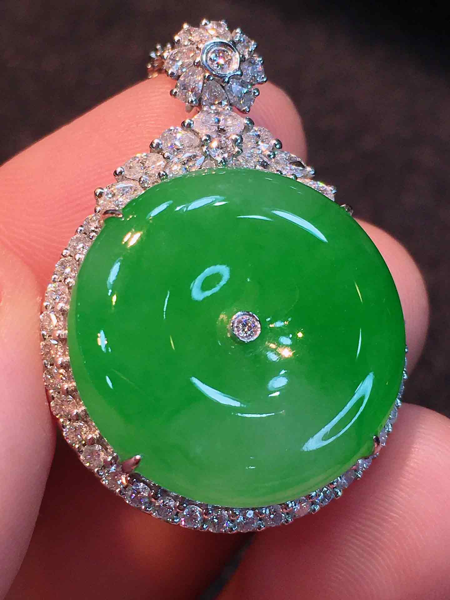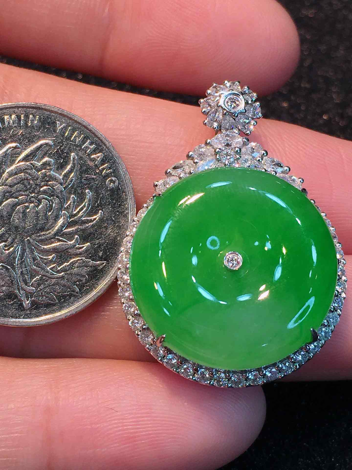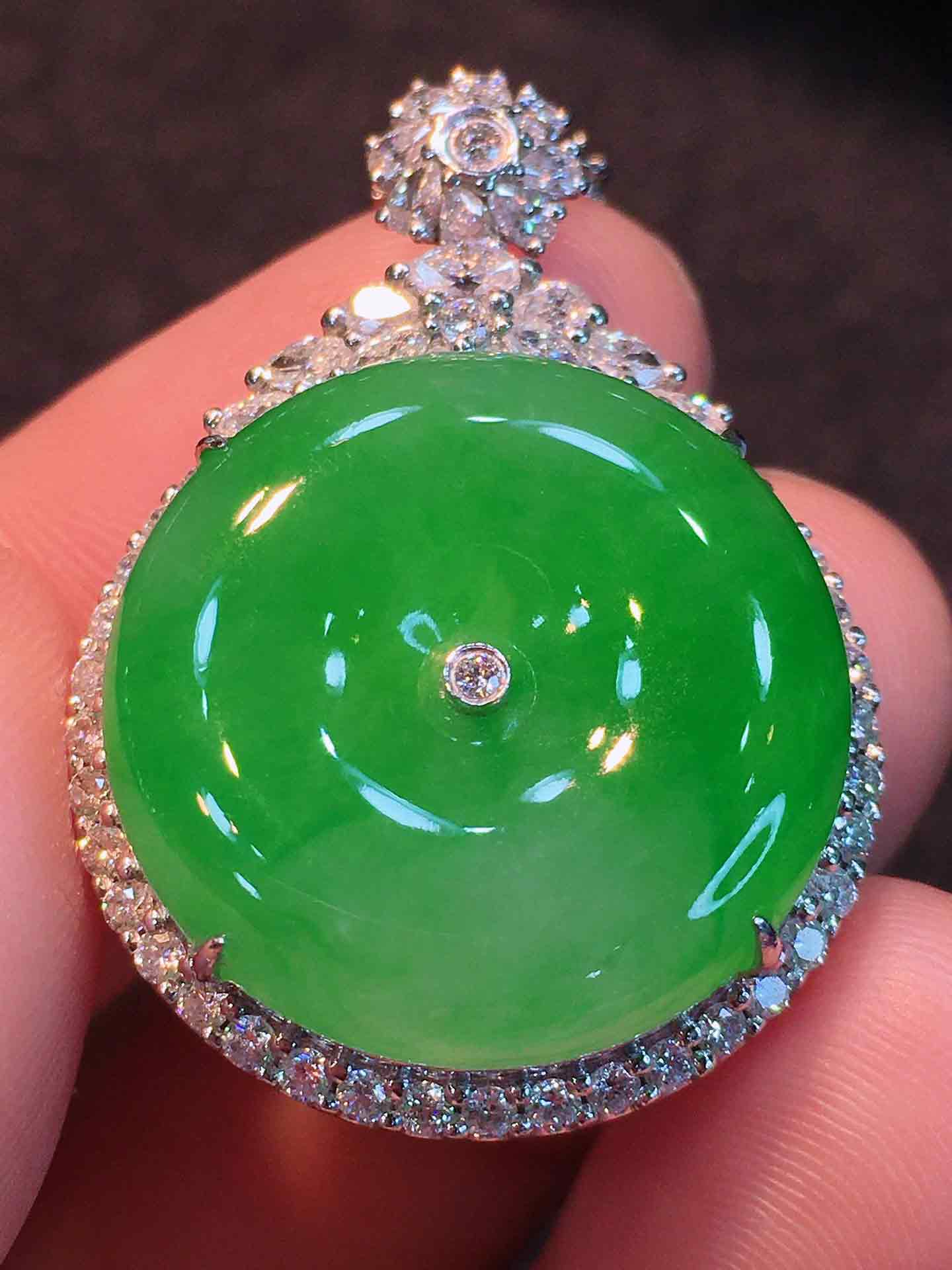 🍀满色平安扣吊坠,平平安安 厚桩饱满,翠色阳艳,种老起胶,水色相融。18K金伴钻豪华镶嵌