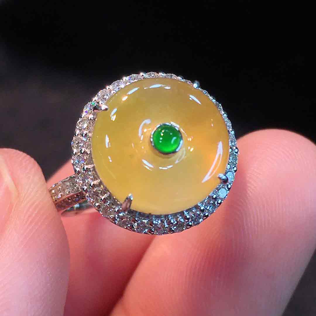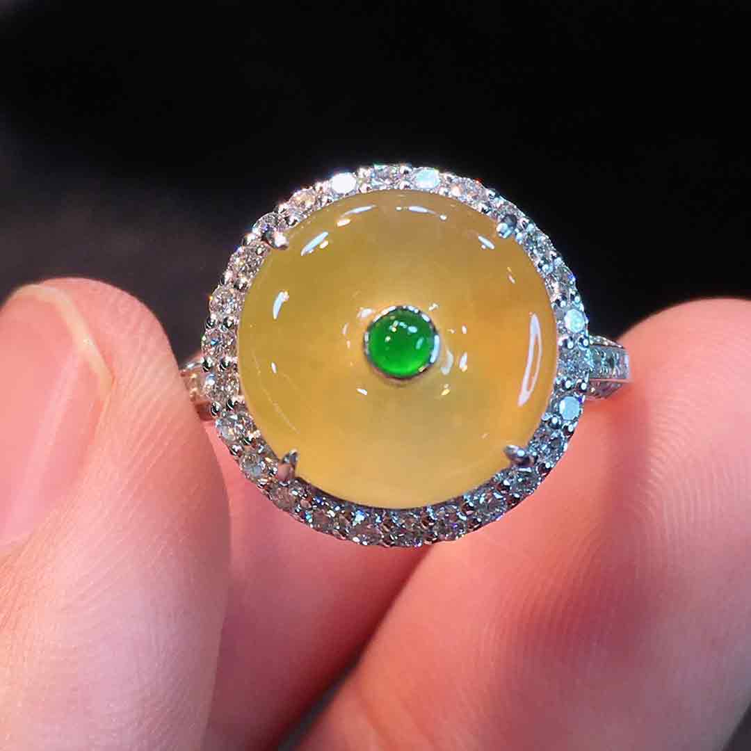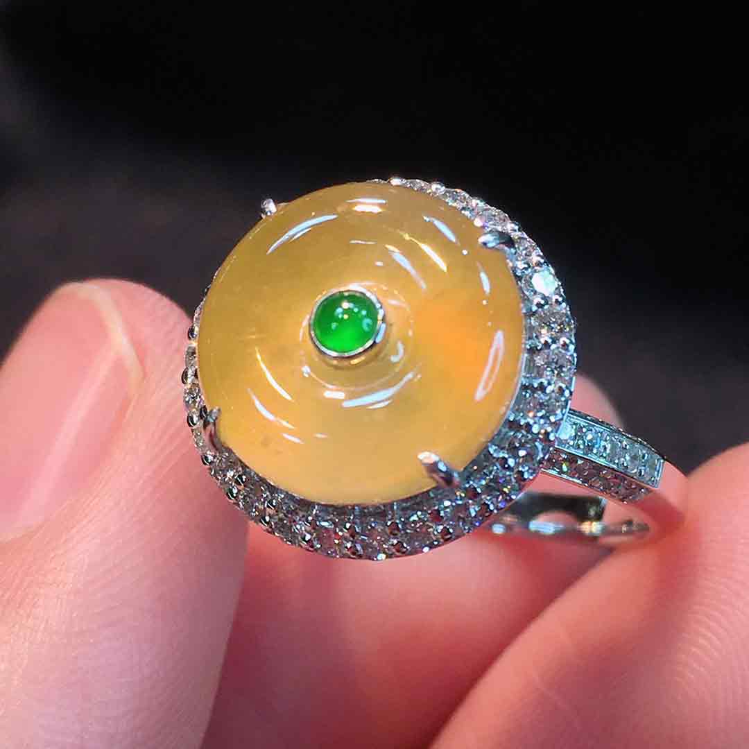 🍀冰种金翡平安扣戒指➕吊坠两用款 冰透水润,种老起胶,浓郁鸡油黄,美得让人沉醉。18K金伴钻豪华镶嵌